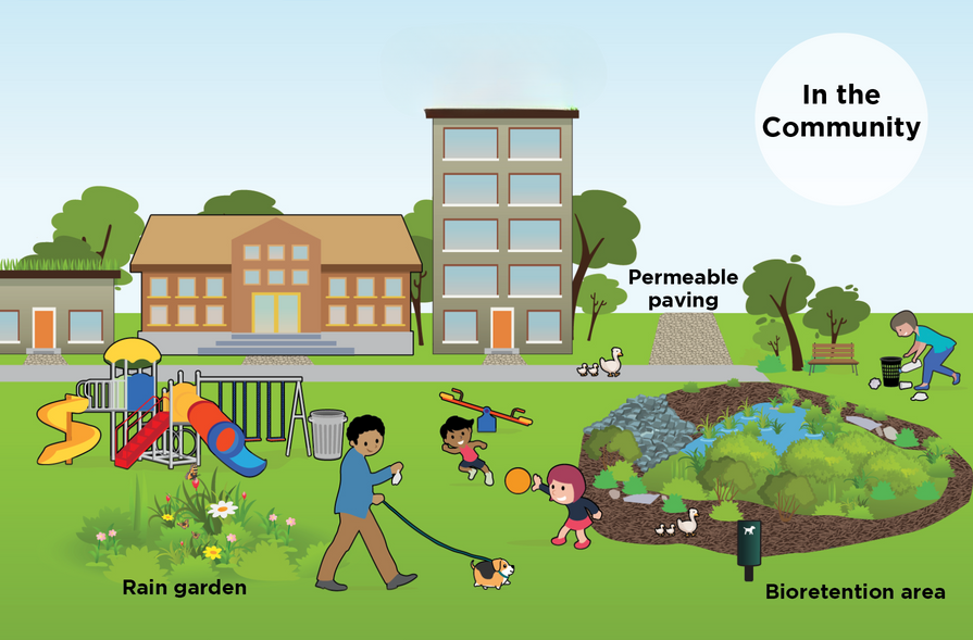 You can support stormwater management projects in your community that both benefit the environment and bring value to the community. Local schools, parks and private institutions can do a lot to reduce the impact from rainfall on rivers, lakes, and streams: